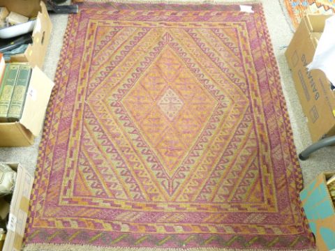 CAZAK RUG, muted wine ground with central diamond and chevron panel with triple bordered edge, 123 x 103cms