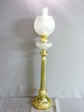 EXCELLENT GOTHIC REVIVAL BRASS OIL LAMP with screw-in frosted font, duplex wick burner, collar and shade gallery in brass with a globular cut and frosted shade, 89cms overall height