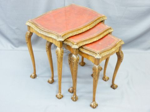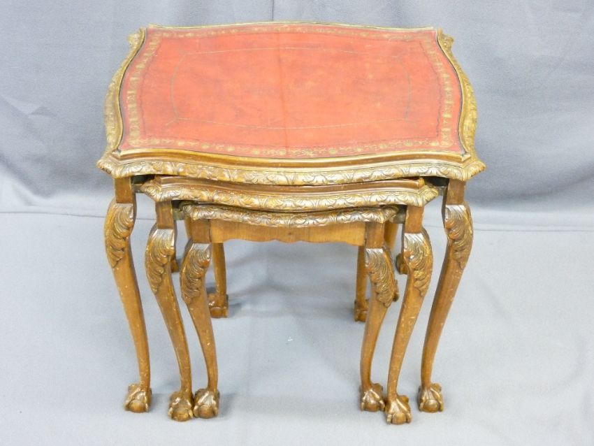 GOOD SET OF THREE REPRODUCTION CARVED WALNUT SIDE TABLES with gilt tooled leather inserts and glass tops on ball and claw feet, 57cms H, 58cms W, 44cms D