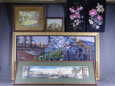REX WHISTLER - print of his largest ever work, 13 x 59cms, two still life paintings on panel, steam locomotive tapestry, 39 x 77cms and other prints