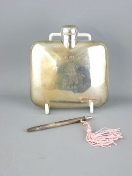 SILVER SPIRIT FLASK of slightly curved form with initials and date for 1905 and Lion Crest, 3.2ozs Chester 1904 by William Neale and a lady's handbag pencil