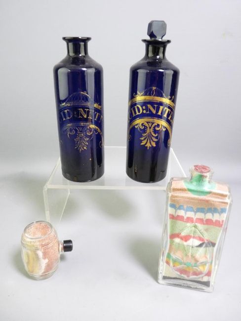 PAIR OF BRISTOL BLUE GLASS CHIMNEY SHAPED 'NITRIC ACID' JARS, (one stopper missing and chip to neck of one), 14cms high and a medicinal jar containing coloured sand and a miniature glass barrel similarly filled