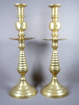 PAIR OF FINE BRASS CANDLESTICKS WITH DRIP TRAYS