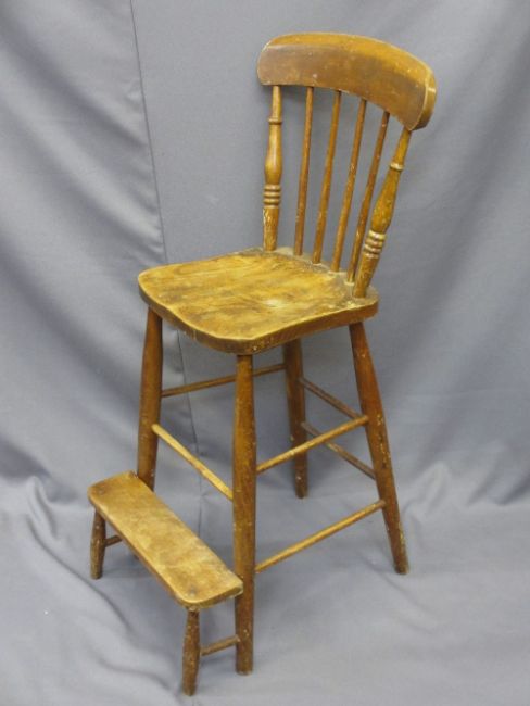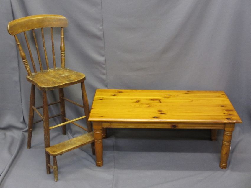 VINTAGE HIGH CHAIR with step base and a modern pine rectangular coffee table, various measurements