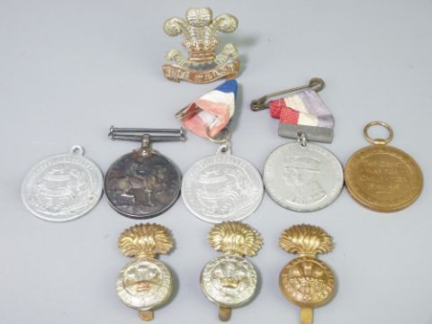 WWI MEDAL PAIR awarded to '40571 Private M G Davies' Royal Welsh Fusiliers, three RWF cap badges and one other marked 'The Welsh', a 1937 Coronation medallion and two aluminium examples stamped 'Victory, Justice, Peace - The Great War 1914-1919'