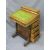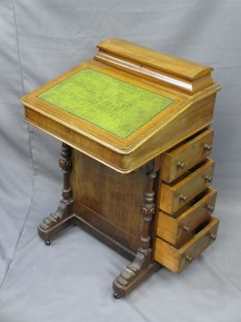VICTORIAN MAHOGANY DAVENPORT with a reproduction oak stool, lidded stationery top and tooled green leather insert lift-up slope with interior single drawer, four opening side drawers with turned modern knobs, repeated to the opposing blind drawers with carved front detail, 83cms H, 54cms W, 53cms D