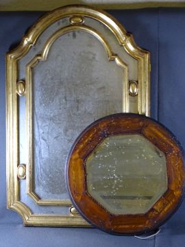 UNUSUAL GILT FRAMED WALL MIRROR and an inlaid wooden circular mirror