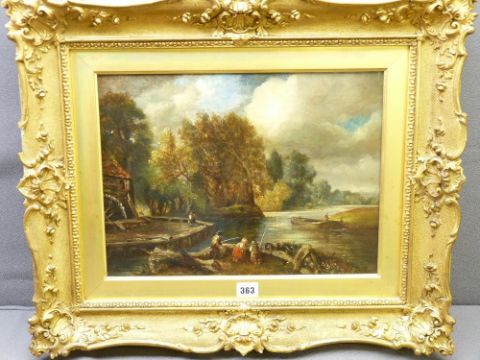 UNSIGNED OIL ON CANVAS - children fishing with rod, boats and figure to background, 29 x 39cms