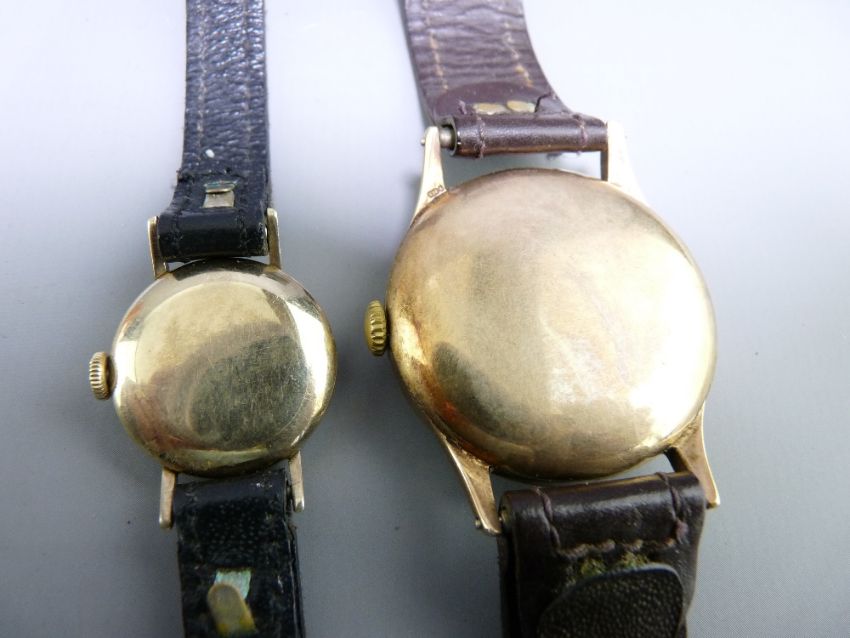 LONGINES, lady's and gent's 9ct gold cased wrist watches with leather straps, associated box and booklet