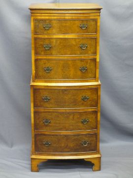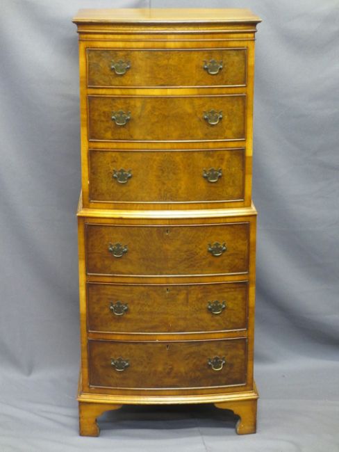 REPRODUCTION WALNUT BOW FRONT CHEST ON CHEST, 131cms H, 56cms W, 39cms D