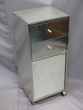 ULTRA MODERN MIRRORED & POLISHED METAL STORAGE CABINET of two drawers over a lower cupboard door, 80cms H, 35cms W, 30.5cms D