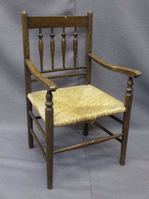 CHILD'S VINTAGE RUSH SEATED ARMCHAIR with spindle gallery back, 68cms H, 39cms W, 33cms seat D