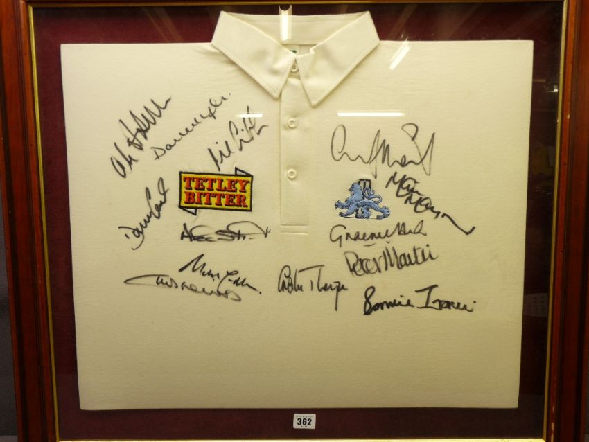 SPORTING MEMORABILIA - framed 'England Tetley Bitter' cricket shirt signed by Graham Thorpe, Graeme Hick, Ronnie Irani, Peter Martin, Alec Stewart and others