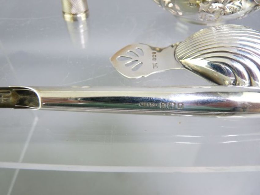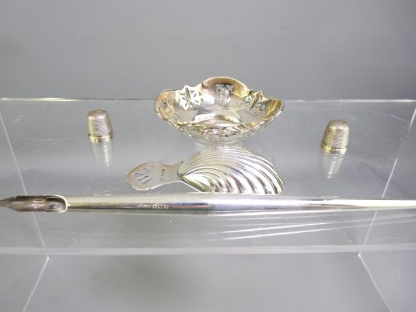 SMALL SILVER, a quantity, including a desk pen inscribed 'Christmas 1931', London 1930, a shell shaped caddy spoon, London 1968, a small pierced bowl, Birmingham 1923 and two sterling silver thimbles