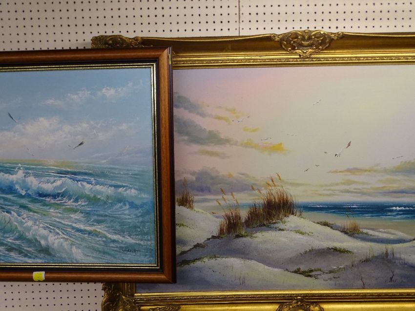 T GAILEY oil on canvas - breaking waves with seagulls overhead, signed, 50 x 60cms and an unsigned oil on canvas, a similar scene in a gilt frame, 60 x 90cms