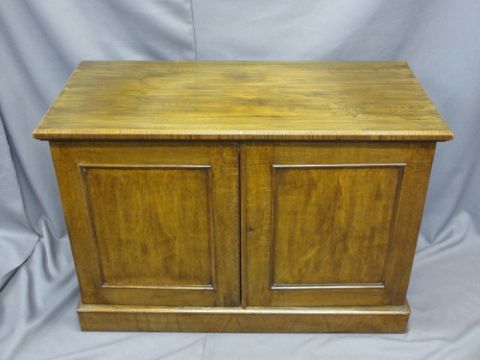 CIRCA 1900 CAMPAIGN STYLE SIDEBOARD of two opening panel doors before an interior arrangement of two short over two long drawers with inset cup and pull brass handles, 73cms H, 107cms W, 50.5cms D