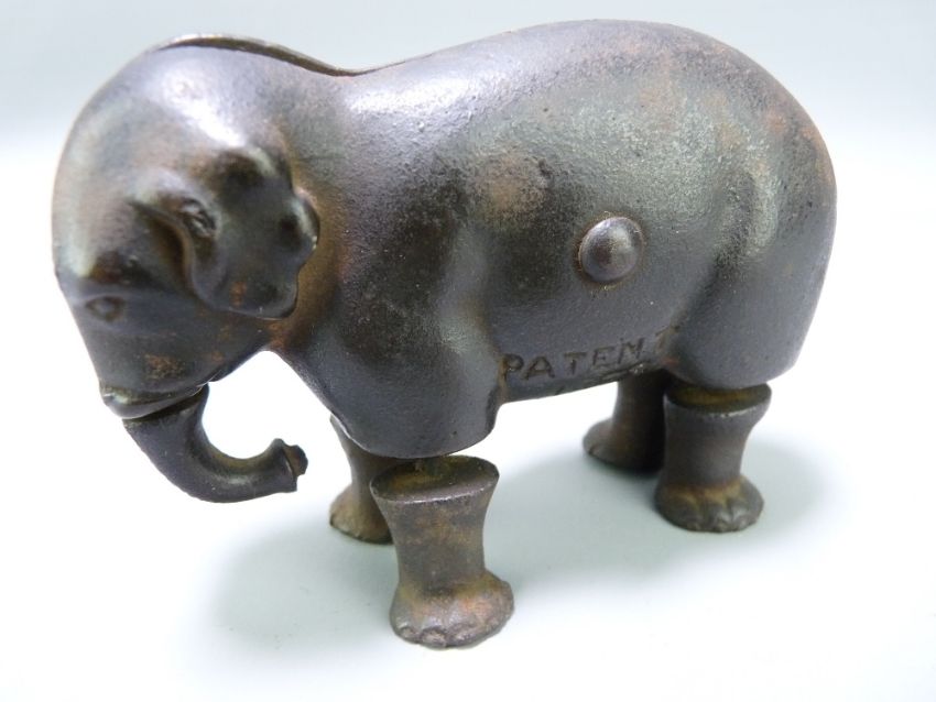 PATENT 1873 CAST IRON WALKING ELEPHANT TOY manufactured by The Ives Toy Company of Bridgeport, Connecticut, 8.5cms L