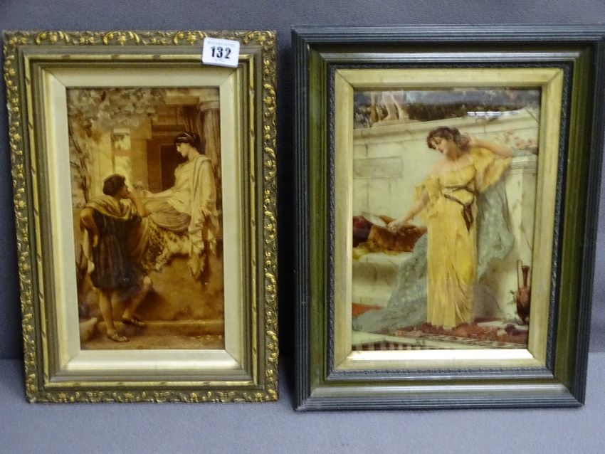 PAIR OF SIMILAR THEMED CRYSTOLEUMS, one being a young woman looking wistfully into a hand mirror, 24.5 x 16.5, the other of a courting couple, 24 x 14cms