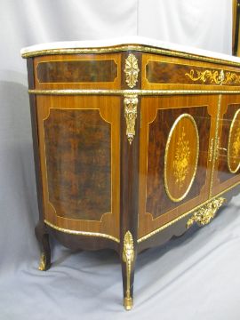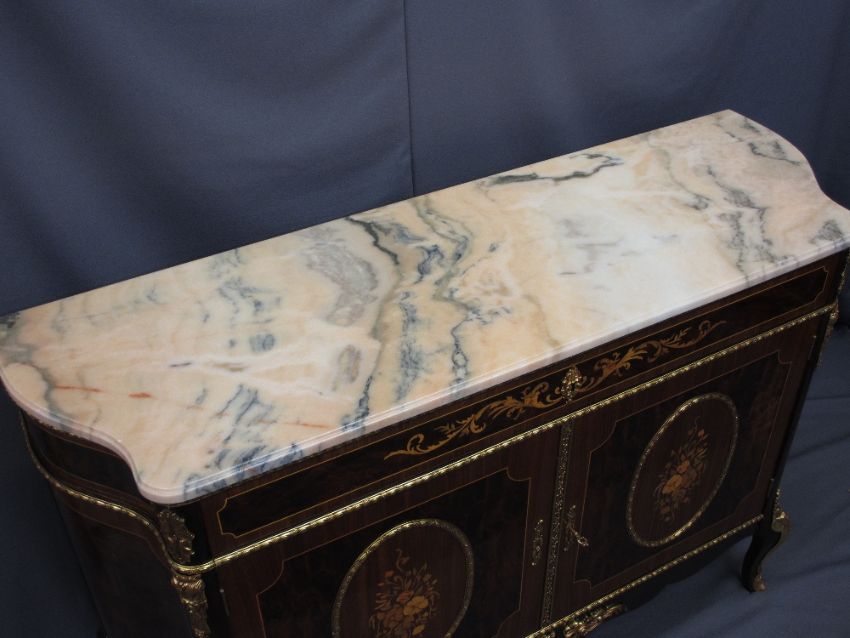 EXCELLENT REPRODUCTION EMPIRE STYLE PINK MARBLE TOP SIDE CABINET, the shaped top over a single frieze drawer, twin cupboard doors and shaped ends, all with gilt metal mounts and inlay with boxwood stringing, 92.5cms H, 142cms W, 46cms D