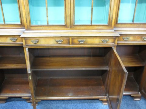 EARLY 20TH CENTURY REPRODUCTION WALNUT BREAKFRONT CABINET BOOKCASE having four upper glazed doors with shaped beading detail and interior adjustable shelves over a base of four slim frieze drawers and four cupboard doors on bracket feet, 209cms H, 182cms W, 33cms D