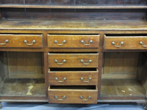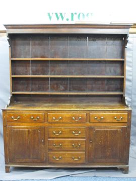 NORTH WALES OAK DRESSER CIRCA 1820, canopy three shelf rack with wide back boards and shaped side detail over a base having a T arrangement of six pine lined opening drawers and twin flat panel cupboard doors on bracket corner feet, 202cms H, 172cms W, 46cms D, original swan neck handle brassware and inlaid button detail
