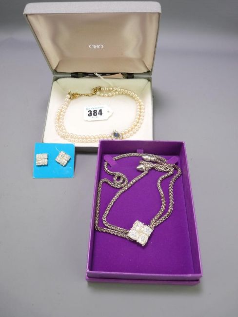 COSTUME JEWELLERY - two items including a double strand set of Ciro simulated pearls with diamante centre and gilt clasp and a Buckingham jewellery necklace and earring set