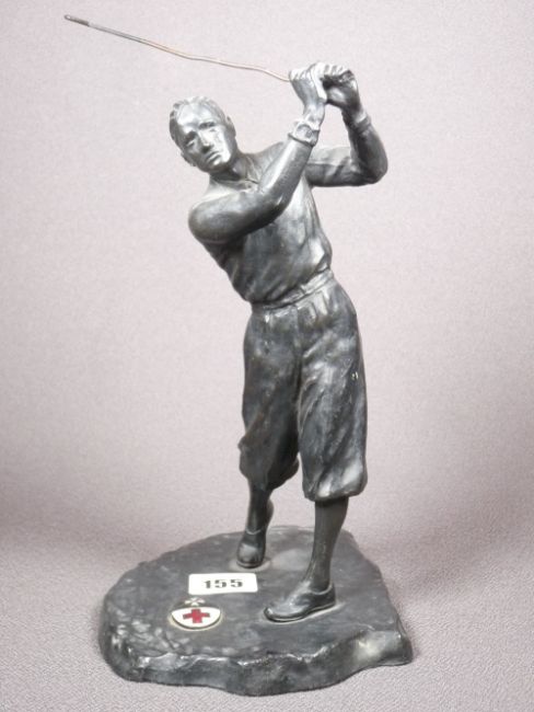 SPELTER FIGURE OF A GOLFER inscribed 'Denhenan ??? 1930', 27cms H