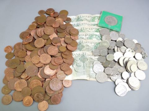 MIXED MODERN BRITISH BRONZE COINAGE, a large parcel and modern silver coinage (17ozs), six British one pound notes, all with folds, Chief Cashier Page and a 1977 Silver Jubilee Crown in plastic wallet