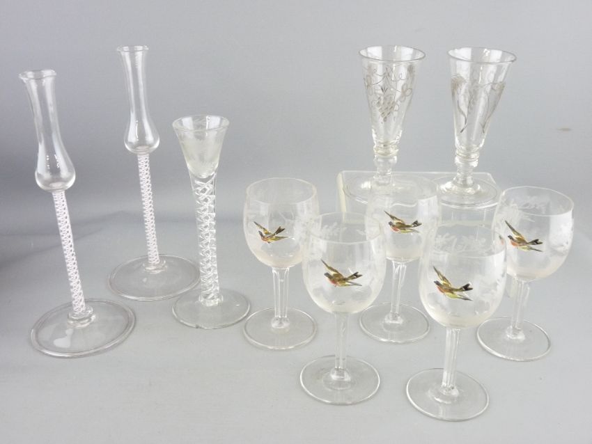 18TH CENTURY & LATER DRINKING GLASSWARE, a small collection including Air twist stems, knopped and engraved pair with folded foot and five etched examples with raised enamel paint decorated birds, various measurements (some chipped)