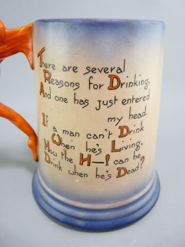 CARLTONWARE DEVIL HANDLE MUSICAL TANKARD, printed detail includes 'In Loving Memory' with Bass ale bottle in a wreath and colour highlighted 'Rhyme' to the reverse, music box working, 13cms H