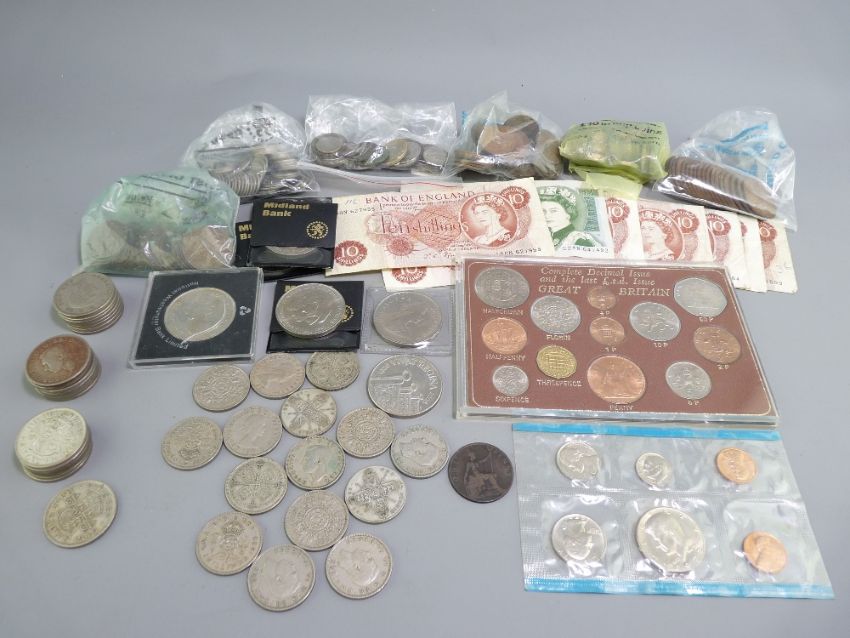 PRE-DECIMAL COINAGE & BANK NOTES including eight 10 shilling notes, a small collection of commemorative crowns, a decimal and last pre-decimal issue pack and a small quantity of USA and other Continental coinage