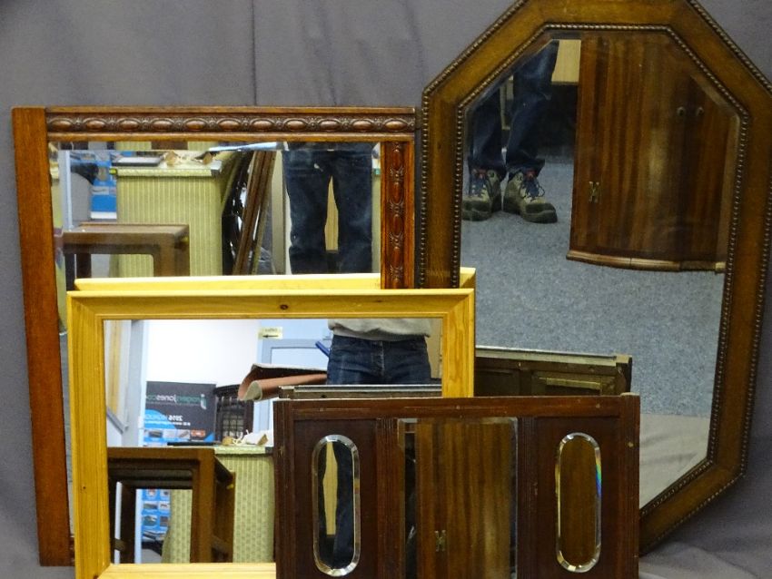 ANTIQUE BOW FRONTED CORNER CUPBOARD with painted interior and two lower drawers, another antique corner cupboard with secret interior drawers and shaped shelves and a parcel of wall hanging mirrors