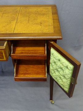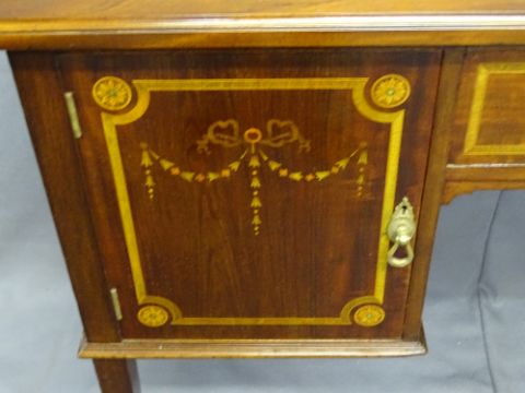 EDWARDIAN TOOLED LEATHER TOP KNEE HOLE DESK with garland inlay, 80cms H, 122cms W, 54cms D