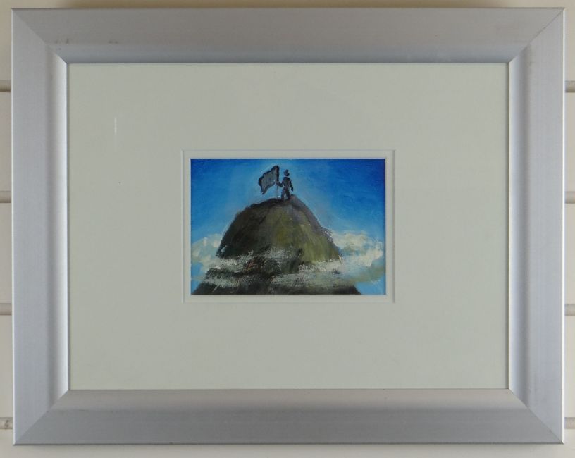 MICHAEL GUSTAVIUS PAYNE (b.1969) oil on card - figure with flag on top of hill, entitled 'Mine All Mine', signed and dated 1997, 12 x 17cms