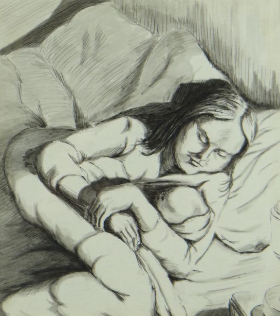 ROBERT HUNTER (1920-1996) ink and wash - mother and child in bed, signed, 20 x 18cms