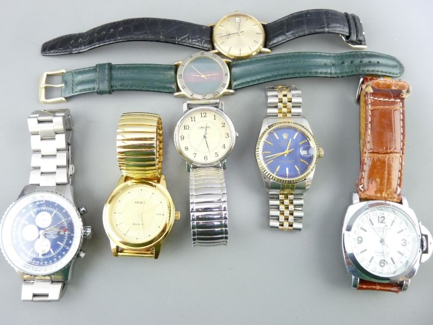BRAND MARKED GENT'S WRIST WATCHES - a collection including a gold plated Rotary with baton indicators and date aperture, No '4224999' to the case back