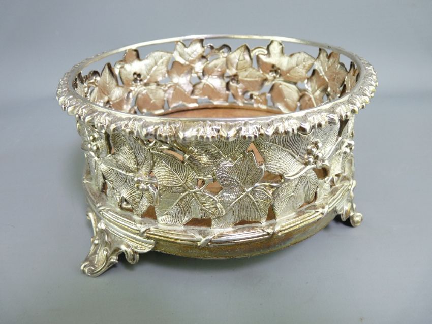 WILLIAM IV SILVER WINE COASTER, Maker Henry Wilkinson & Co openwork fruit and vine work, raised on three feet with mahogany base, 15cms diameter, indistinct date mark