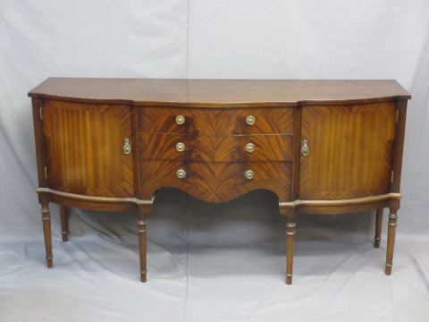 REPRODUCTION MAHOGANY SIDEBOARD with bow front, three central drawers flanked by cupboards, 96cms H, 170cms W, 53cms D