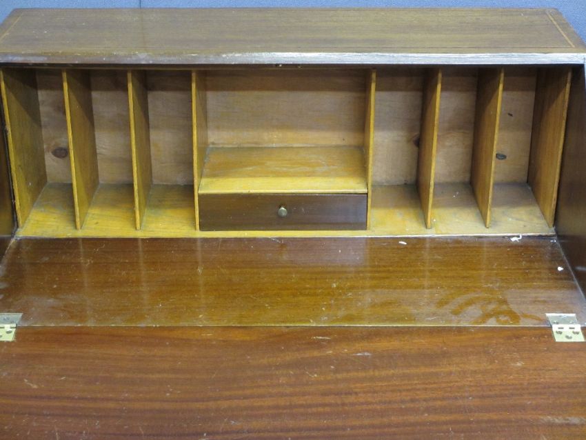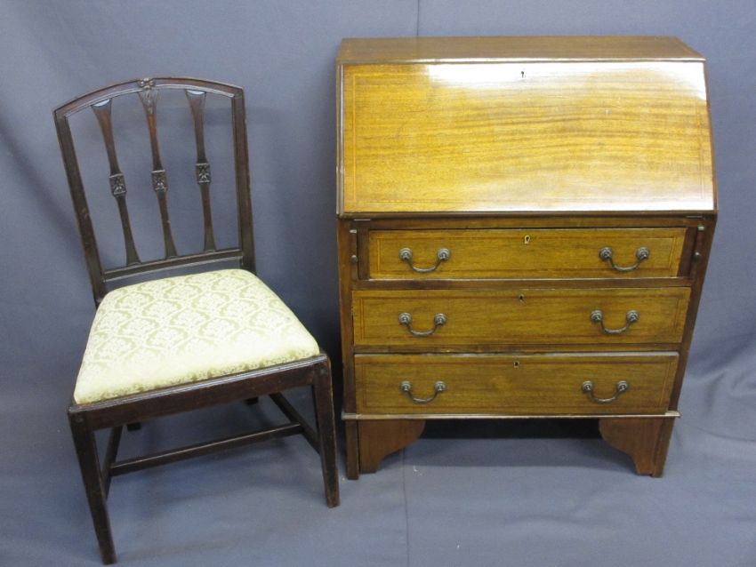 MAHOGANY BUREAU with string inlay detail on bracket feet and an antique mahogany dining chair