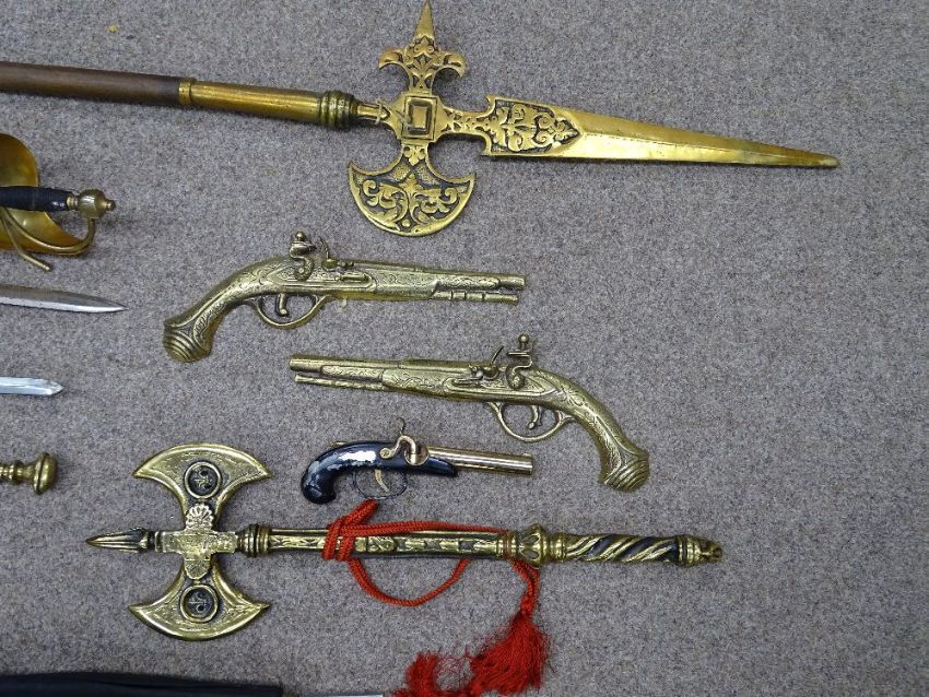 ORNAMENTAL SWORDS, a pike staff, vintage umbrella, novelty pistol cigarette lighter, brass ornamental battle axe, pair of pistol plaques and a copper jug