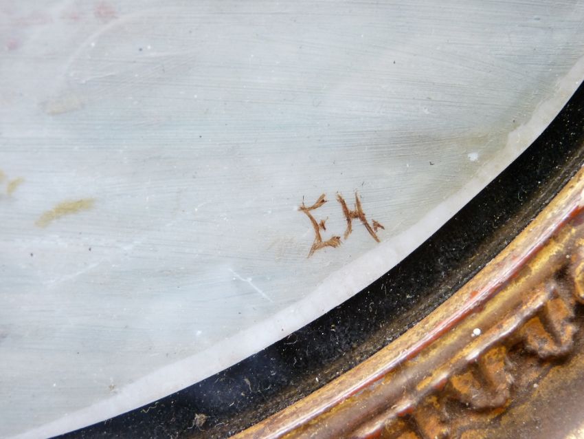 CIRCULAR MARINE PAINTING ON MILK GLASS, initialled E H, 28cms diameter and another marine watercolour