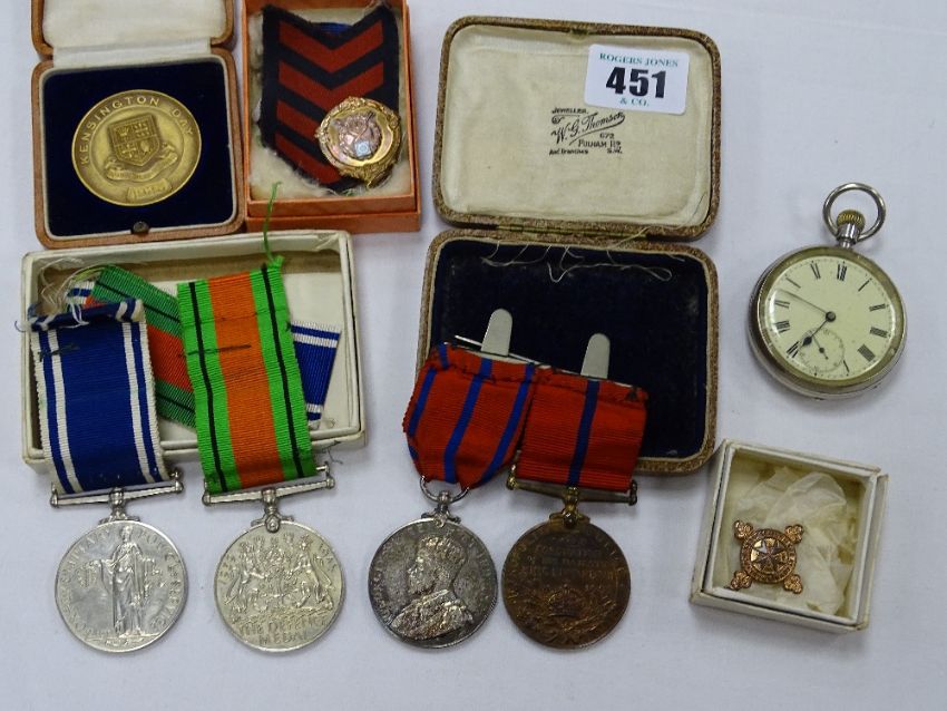CYRIL WILLIAMS - Metropolitan Police 'Coronation' medal 1902 and 1911, 'The Defence' medal 1939 - 45, 'Exemplary Police Service' medal ETC and a white metal pocket watch (star and crescent probably 800 silver)