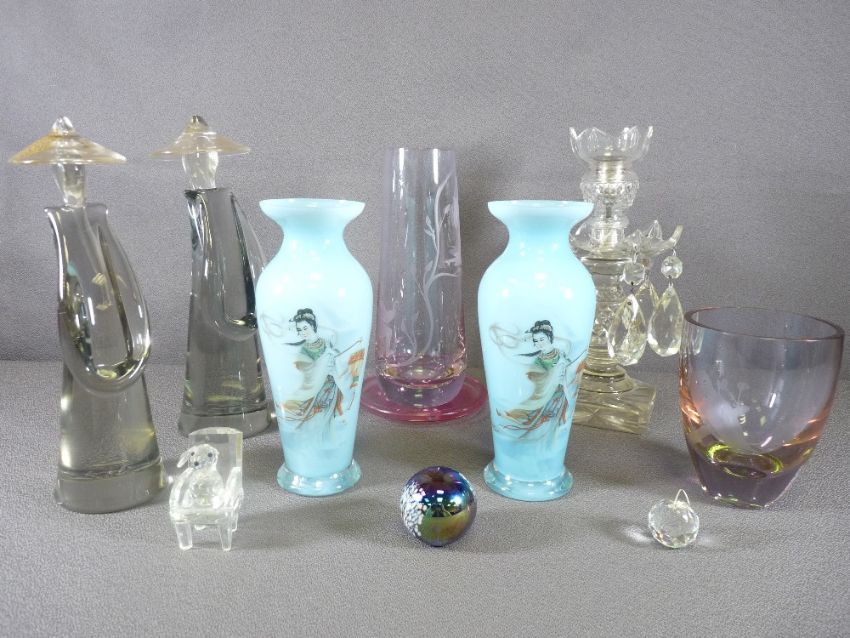 GLASSWARE - a pair of Oriental decorated vases, a lustre lamp ETC