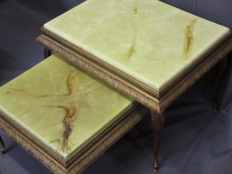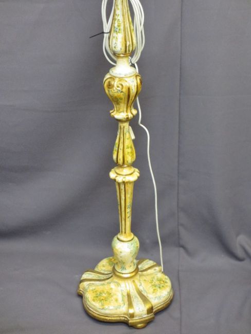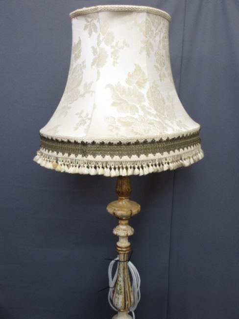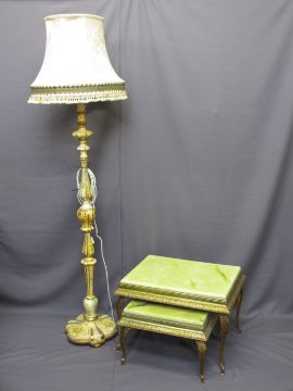 FRENCH STYLE GILT & PAINTED STANDARD LAMP with shade and two faux onyx and gilt wood tables on brass supports, various measurements
