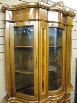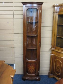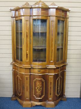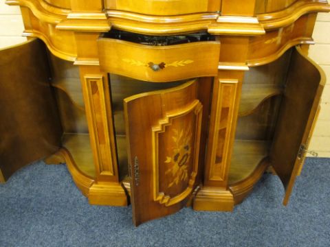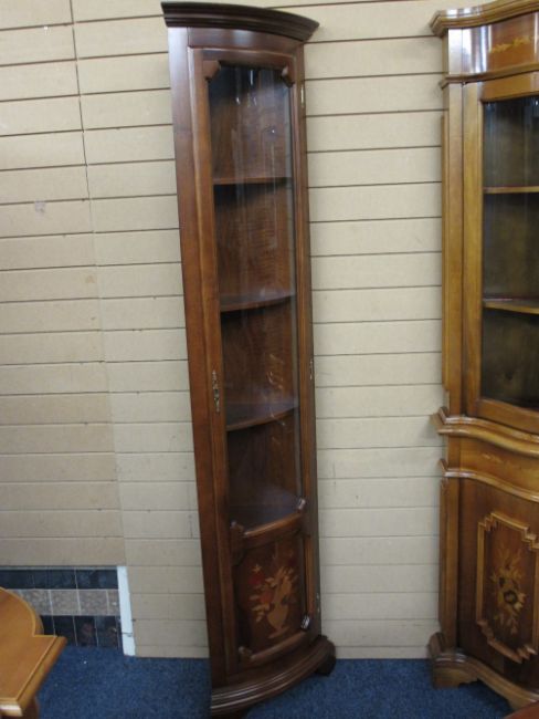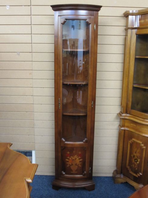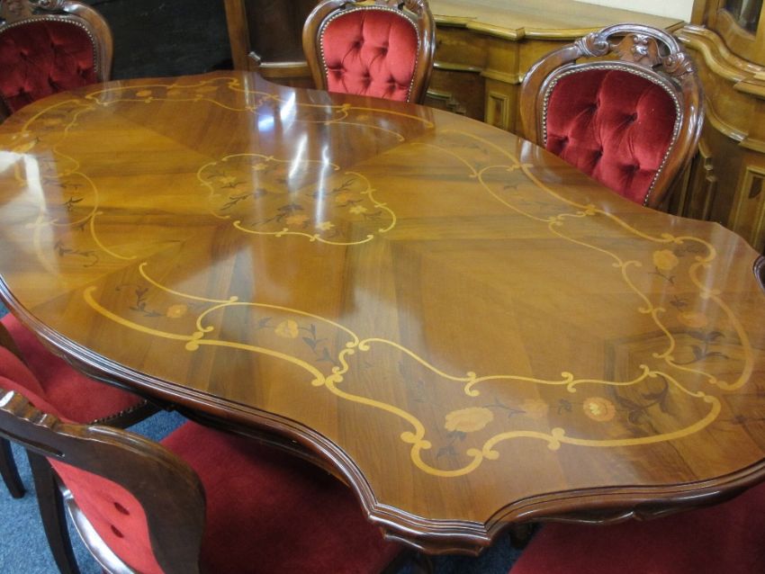 ITALIAN INLAID DINING ROOM SUITE consisting of table and six chairs, glaze top display and matching sideboard base with a single door glazed slim corner cabinet