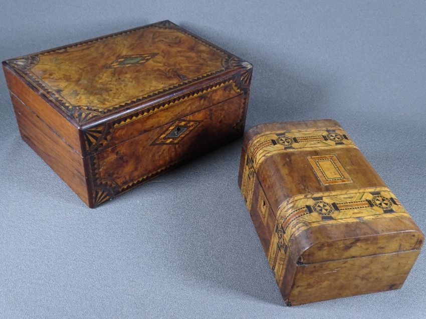 TWO TREEN WORK BOXES with inlay detail and haberdashery contents