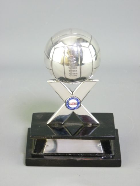 BIRMINGHAM SILVER FOOTBALL TROPHY, Birmingham 1970, maker Deakin and Francis, applied enamel badge reads 'The Symbol of The Happy Circle', mounted upon a rectangular wooden base, 12cms H, 8.5cms across
