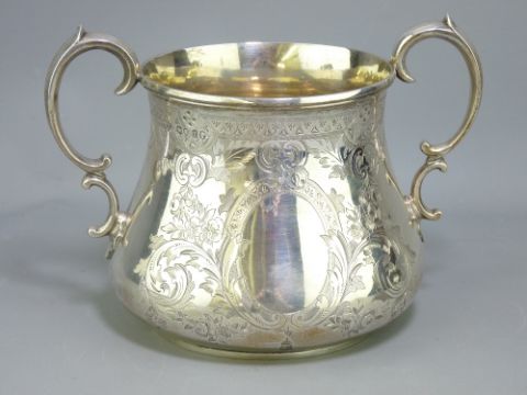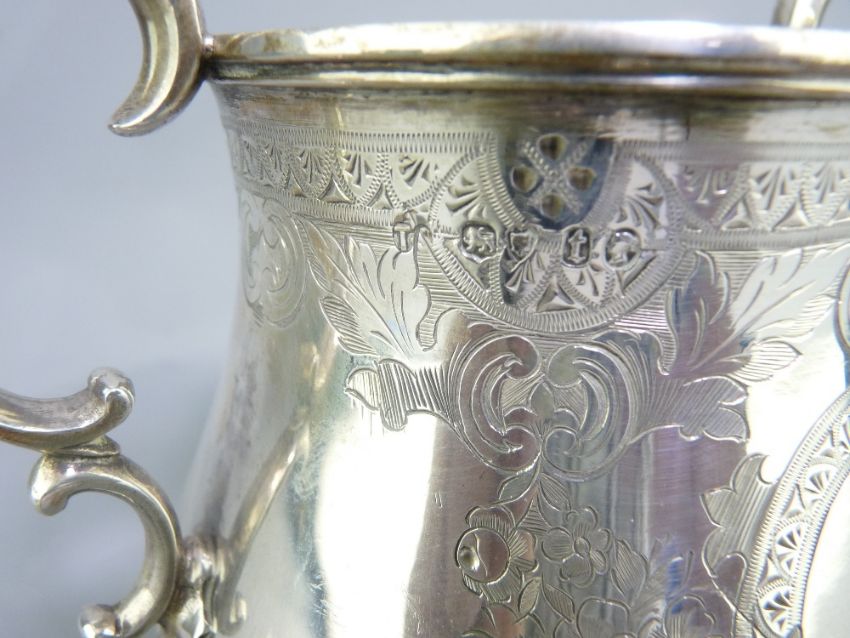 SILVER TWO-HANDLED SUGAR POT, London 1874, maker Thomas Smily, chased decorated body with vacant cartouches and gilt lined interior, 11 troy ozs