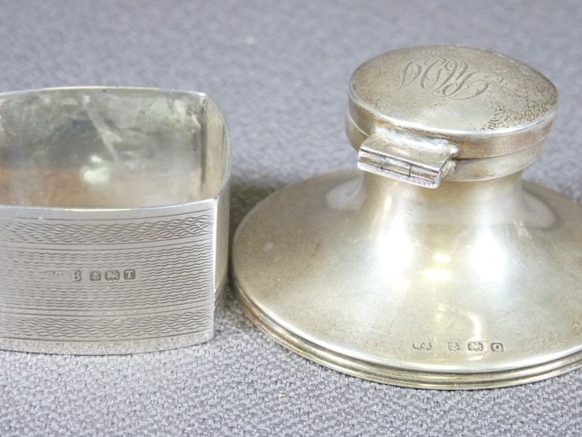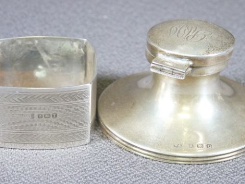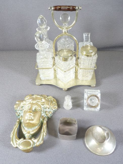 SILVER INKWELL, electroplate condiment set, good brass door knocker ETC