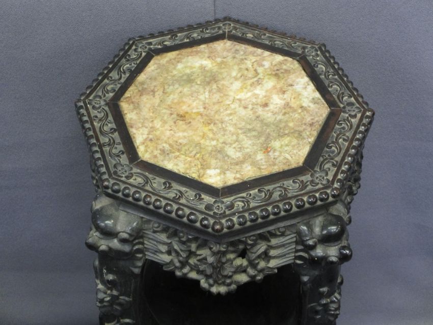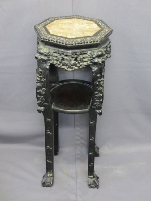 CHINESE CARVED HARDWOOD STAND with inset marble top and under-tier shelf, 84cms H, 35cms W